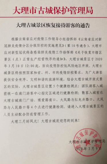 3月9日,云南省大理市古城保護(hù)管理局發(fā)出通告,宣布大理古城景區(qū)于2020年3月10日12:00起,面向疫情防控低風(fēng)險(xiǎn)地區(qū)開放。