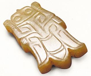 甘肅武威磨嘴子漢墓出土的一件玉蟬,長6.4厘米,寬3.1厘米,厚0.8厘米。青白玉,圓雕。腹平、背凸。玉蟬頭中部凸起,下有穿孔用于系掛。雙面用陰線雕刻出蟬的雙目、雙翼、腹、尾等輪廓。玉質(zhì)晶瑩,造型逼真,為佩玉。武威雷臺漢墓出土的一件玉帶鉤,長10厘米,寬1.5厘米,厚2.7厘米。質(zhì)地為青玉,用淺浮雕刻出。鉤首呈龍頭形,高而窄,鉤肚圓鼓,背有一圓鈕。當是貴官豪強的用物。