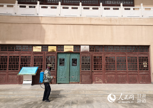 3月21日起,瓜州縣世界文化遺產(chǎn)鎖陽(yáng)城遺址景區(qū)和草圣故里文化產(chǎn)業(yè)園恢復(fù)開(kāi)放。圖為張芝紀(jì)念館工作人員正在進(jìn)行消殺工作。(李雪 攝)