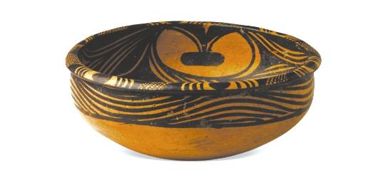 馬家窯文化馬家窯類型(距今約4800年),1966年蘭州市王保保城出土。這是一只工藝精湛,保存完好的彩陶盆,這只旋紋彩陶盆最大的特點是盆內壁上繪的三組變體人面紋,同學們看出這組圖像人面嗎?看懂人面紋需要發(fā)揮想象力,總之,我們的先祖抽象表達的能力及想象力真令今人景仰!