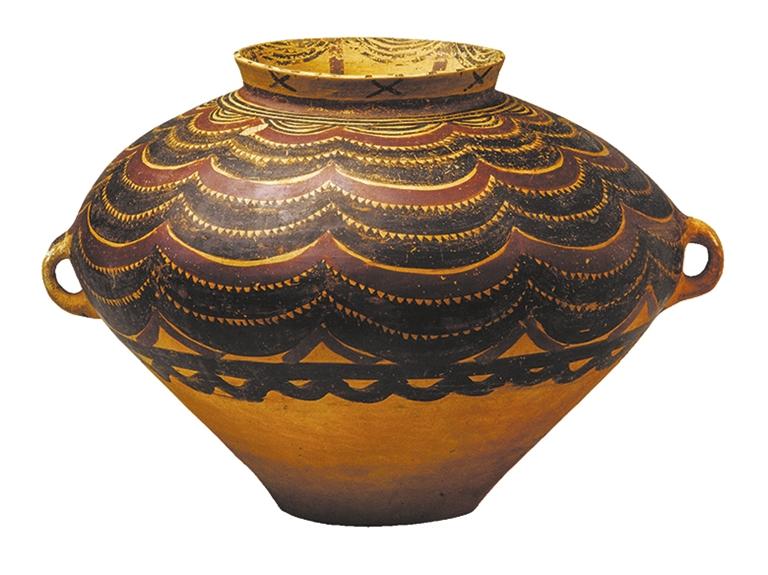 馬家窯文化半山類型(距今約 4500 年),廣河縣地巴坪出土。這是雙耳甕器型大氣貴重,施以紅、黑二彩,紅、黑彩交替使用,腹部繪多層連續(xù)垂弧紋和鋸齒紋,黑、紅彩交替使用,由三組分層連續(xù)的垂弧紋組成整體圖案,每層由兩層黑色帶紋和一層紅色帶紋組成,黑色帶紋上緣繪向上的鋸齒紋。整個圖案密集繁復,俯視猶如一朵盛開的鮮花,造型豐滿,色彩鮮艷。