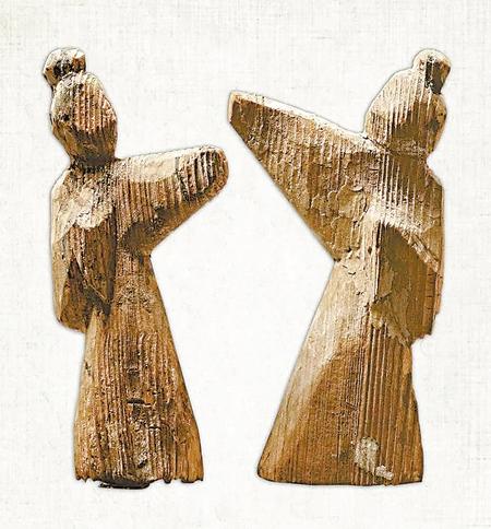 武威磨嘴子漢墓出土,現(xiàn)藏甘肅省博物館的兩件彩繪木舞蹈俑,其中一件寬4.9厘米,厚3.5厘米,高26.7厘米。木俑梳高髻,著長袍,身體向右傾斜,左臂置于胸前,右臂舉起,頭微側(cè),作舞蹈狀。另一件木俑底寬5.4厘米,高14.5厘米,削制而成。以黑、紅兩色繪五官和衣領(lǐng)等。木俑挽高髻,穿袍服。左臂撫胸,右臂向前上舉起,身子傾斜,作舞蹈狀。它們和同一地點(diǎn)出土的漆樽舞蹈畫一樣,都是現(xiàn)實生活中官僚貴族富戶舞伎的藝術(shù)再現(xiàn)。