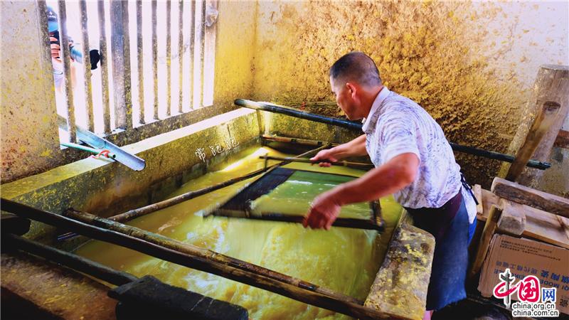 隆回縣灘頭鎮(zhèn)桃林村手工抄紙作坊,已經(jīng)成為一處著名的文旅項目景點。走進陶林村,一棟棟青瓦石墻的新屋吸引了人們的目光。屋外山坡竹林茂密,山溪流水潺潺,屋內手工抄紙制作的原料、工具布置的次序井然,手工抄紙的全套工藝流程在這幾棟屋中得以完整體現(xiàn)。手工抄紙技術歷史悠久,始于隋唐,至明朝時抄紙已經(jīng)非常盛行。上世紀八十年代鼎盛時還曾遠銷東南亞和日本。非遺傳承人李志軍今年61歲,自稱“紙蟲”,帶領著全家人承襲著祖宗留下的獨特技藝。而支撐著李志軍的堅守的,是隆回縣文旅部門的巨大付出和努力。2011年,他們支持李志軍建立了手工抄紙標準化作坊,2016年又對該作坊進行擴建,使之成為國家級非遺項目。灘頭手工抄紙作坊占地面積1714平方米,是灘頭手工抄紙有史以來最大的作坊,同時也是集生產(chǎn)、創(chuàng)新、傳承、展示、研學為一體的重要基地和文旅基地。