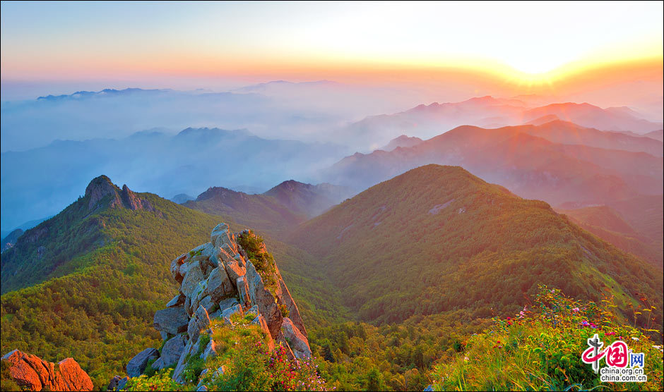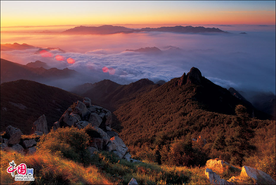 當(dāng)北京的第一縷陽光從這里升起。站在海拔2118米的頂峰平臺(tái)上,遙望東方,天際中開始露出幾抹灰色的浮云,隨后不斷地升騰、擴(kuò)大,繼而天邊漸紅,紅色越來越深,范圍越來越大,曙光漸露,丹霞輝映,把整個(gè)東方都變成濃濃的紅色。山峰在云霧中時(shí)隱時(shí)現(xiàn),彩云在天際間變幻,有時(shí)像奔馳的駿馬,有時(shí)像仙女飄逸,有時(shí)像玉樹瓊宮……千姿百態(tài),遐想無窮。猛然,比紅色的彩云更火紅、更光亮、更鮮艷的太陽露出了一條邊弧,緩緩上升。四周的云霧似乎忍受不了她那光茫的照射而淡化、隱退,太陽則很快掙脫了云霧與夜色的纏繞,迅速地上升,躍出天邊。霎時(shí),一輪紅日噴薄而出,金光四射,霞光瑞氣,照徹天宇,山巒、萬樹沐浴著朝陽的金輝,令人眼花繚亂。舉目四望,朝霞映照下的霧靈山,群峰起伏,云霧如海,波濤洶涌,九曲十八彎的旅游公路似戲水游龍,在峰巒間若隱若現(xiàn)。