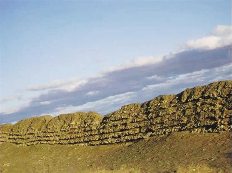 花海漢長城遺址位于玉門市花海鎮(zhèn)西泉村頭墩西側(cè)至二墩東側(cè),西起三墩,東至花海頭墩,全長約3.5公里,長城基寬約2.4米,用沙石、紅柳分層夯筑,最高部分保存有紅柳7層,是河西走廊漢代長城遺址中保存較完好的地段之一。為有效保護漢長城花海段遺址,近年來,玉門市積極實施漢長城防護工程,對該段因長期遭受風(fēng)力侵蝕,病險較為嚴重的長城本體進行了搶險加固,在花海鎮(zhèn)頭墩西側(cè)至二墩河壩間1.5公里地段內(nèi)敷設(shè)了6層全封閉刺鋼絲網(wǎng),并在漢長城內(nèi)外兩側(cè)安裝防護欄、樹立保護標志、埋設(shè)界樁界碑,有效遏制了人為破壞,對漢長城的保護發(fā)揮了積極作用。