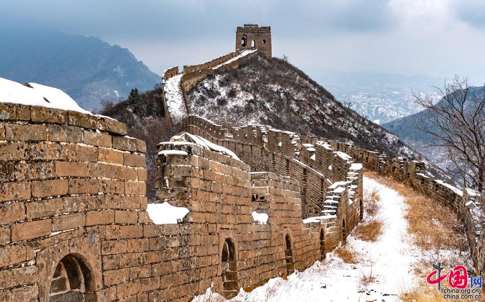 春雪飄灑,一朵朵相擁著落下,氣溫驟降,給人帶來一絲涼意。金山嶺海拔700米,長城依山憑險(xiǎn),起伏跌宕于山水之間,形勢極為雄奇。金山嶺長城是明代修筑的一段長城,西起歷史上著名的關(guān)口古北口,東至高聳入云的望京樓,全長10.5公里,沿線設(shè)有大小關(guān)隘5處,敵樓67座,烽燧2座,因其視野開闊,敵樓密集,景觀奇特,建筑藝術(shù)精美,軍事防御體系健全,保存完好而著稱于世。