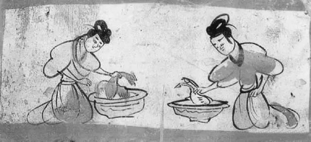 燙雞圖壁畫磚就出土于5號(hào)墓葬,這是繪制在一塊單塊磚面上的壁畫,磚面上用刷得甚薄的含膠白堊土作底,正中繪制二婢相對(duì)跪坐,袖子高高挽起,眉毛微撇,聚精會(huì)神地在各自的盆內(nèi)燙雞去毛。左邊盆內(nèi)雞有冠,為公雞形象;右邊盆內(nèi)雞無(wú)冠,似為母雞形象。用色較為單純,以墨、赭石和朱為主。畫面寥寥數(shù)筆,將婢女勞動(dòng)的情況表現(xiàn)得淋漓盡致,極具生活趣味。尤其是雞脖子被抓住的樣子非常傳神, 生動(dòng)地表現(xiàn)出寫實(shí)的情境。我們從中可以看到,1600多年前的人們殺雞處理食材,跟現(xiàn)在我們殺雞燙毛毫無(wú)二致。
