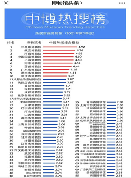 近日,中國博物館熱搜榜發(fā)布今年第一季度全國熱搜博物館百強榜單。其中,三星堆博物館以4.92的熱搜綜合指數(shù)超過故宮博物院首登榜首。據(jù)悉,這也是三星堆博物館首次入選全國十大熱搜博物館并位列第一。