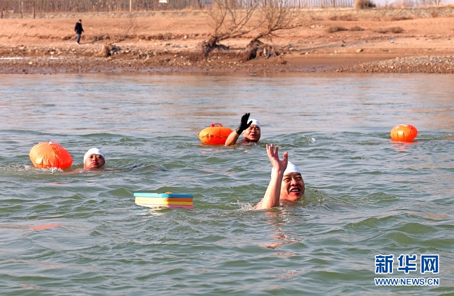 2022年元旦假期,甘肅省白銀市21名冬泳健將冒著嚴寒來到黃河白銀水川段,以漂流或橫渡的方式暢游黃河,歡慶新年。新華網(wǎng)發(fā)(熊江彬 攝)