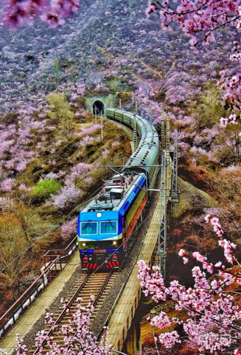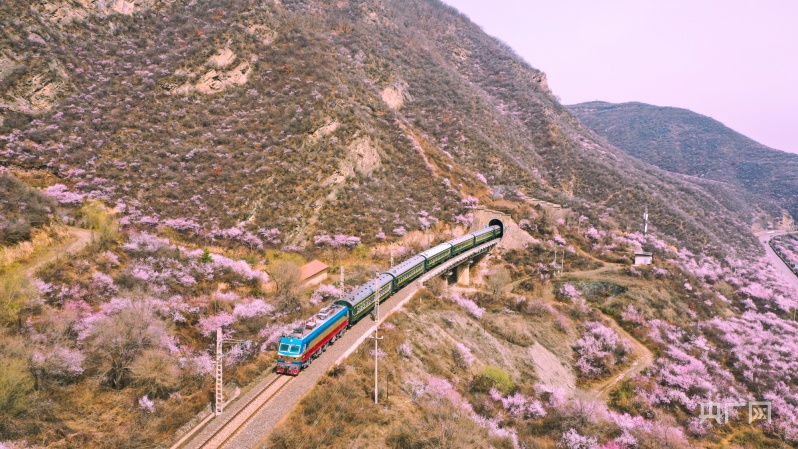 央廣網(wǎng)蘭州4月2日消息 (記者 邸文炯 通訊員 王紅剛 孫淑霞)近日,甘肅省崇信縣峽門(mén)寶中鐵路華亭市安口窯站附近的山上桃花盛開(kāi),花香四溢、如煙似霞?;疖?chē)從山中的隧道穿行而過(guò),駛向一片春光燦爛。