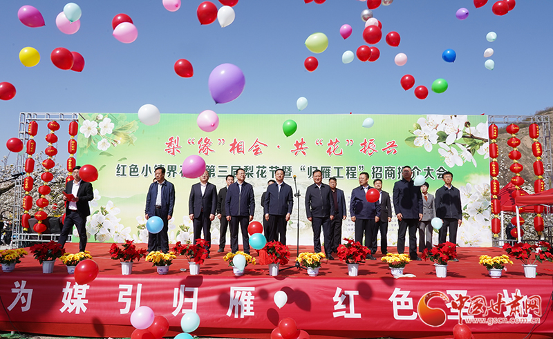 中國(guó)甘肅網(wǎng)4月21日訊(本網(wǎng)記者 李紅軍 通訊員 任建祥 馬麗麗)4月20日,平?jīng)鍪徐o寧縣界石鋪鎮(zhèn)李堡村彩旗飄飄、人頭攢動(dòng)。界石鋪鎮(zhèn)第三屆“梨‘緣’相會(huì)·共‘花’振興”梨花節(jié)暨“歸雁工程”招商推介會(huì)在這里舉行,各界人士集聚梨園賞花游春,共商鄉(xiāng)村振興發(fā)展之計(jì)。