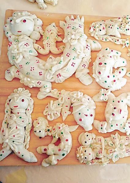 靜寧人的花饃饃,正是應和了消病消災、祈求平安的民間心理。端午禮儀中的面塑,表達著人們對美好事物的向往和祈禱。雖然是以食物的面目出現(xiàn),但那些充滿靈性的造型,卻飽含著人文的意蘊。靜寧人塑成動物的面花中,最多的是蟾蜍和蛇。蛇面花多是盤成一團的,沒有攻擊性又溫和的樣子。蟾蜍面花本地人叫“癩呱子”,形象很可愛,多的是兩只后足弧形對稱,蜷在腹部兩側;兩只前足在頭頂相合,呈環(huán)抱姿態(tài)。也有別出心裁的婦女,會做出十二生肖之類的面花,這些面花,修飾并不夸張,其神韻更勝于外在的精致技巧。所有的端午面花都寄寓著大人們的祈福,但孩子們最喜歡的是動物面花,古靈精怪的,讓他們舍不得摸,更舍不得吃,只能與荷包一起掛在胸前賞玩,或與鄰家的小孩子一起比,看誰的媽媽手更靈更巧。