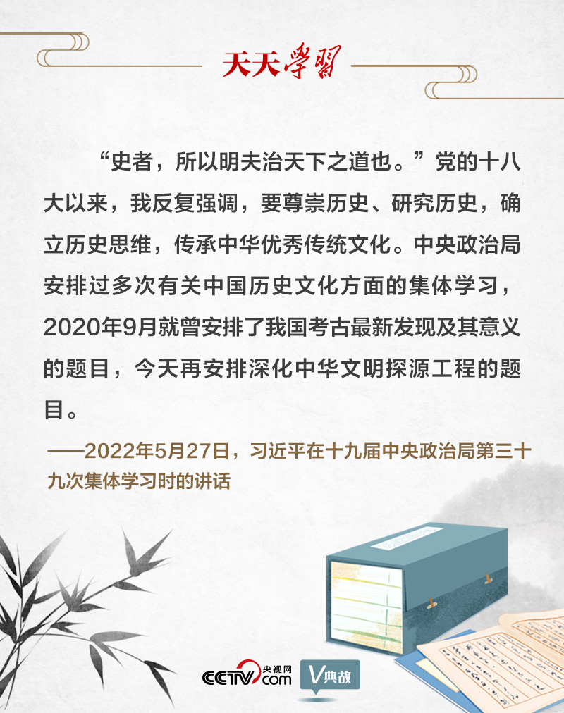 為深入了解中華文明五千多年發(fā)展史,推動把中國文明歷史研究引向深入,推動全黨全社會增強歷史自覺、堅定文化自信,2022年5月27日,十九屆中央政治局就深化中華文明探源工程進行第三十九次集體學習。習近平總書記引用古語“史者,所以明夫治天下之道也”,強調要尊崇歷史、研究歷史,確立歷史思維,傳承中華優(yōu)秀傳統(tǒng)文化。