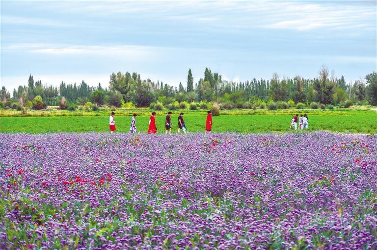 8月7日,游人在敦煌月牙泉鎮(zhèn)百畝花田游覽。 新甘肅·甘肅日報通訊員 王斌銀