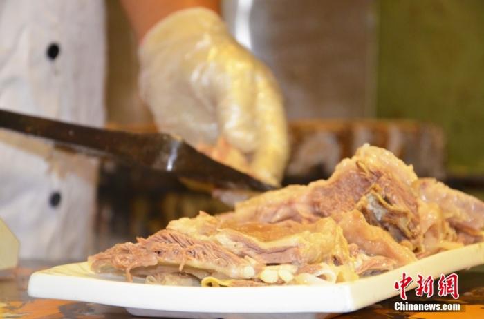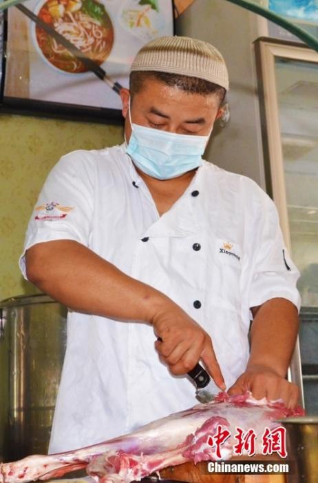 資料圖為8月12日,蘭州主城區(qū)某手抓羊肉招牌老店內,店員正在切新鮮的東鄉(xiāng)羔羊肉。 中新社記者 李亞龍 攝