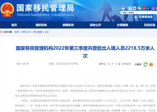 來自國家移民管理局的數據顯示,2022年第三季度,全國移民管理機構共查驗出入境人員2218.5萬余人次;共簽發(fā)普通護照32萬本,較第二季度增加49.5%;簽發(fā)往來港澳臺出入境證件簽注117.2萬本(枚);為在華外國人辦理簽證停留居留證件16.5萬證次。