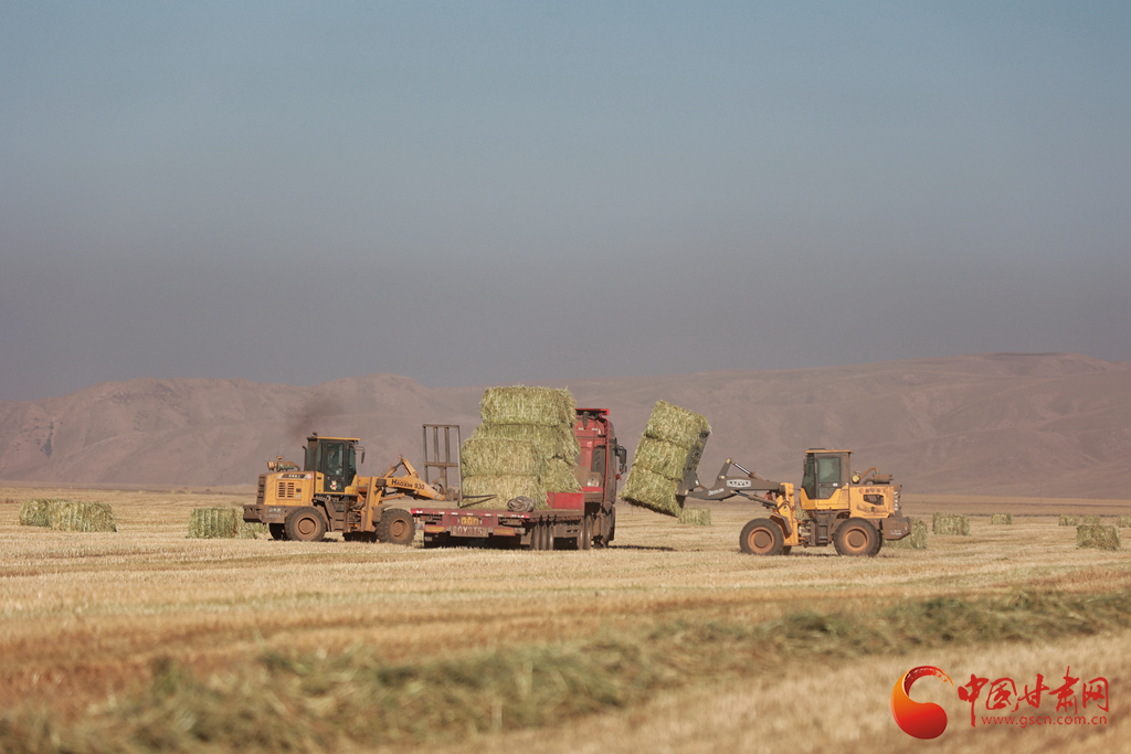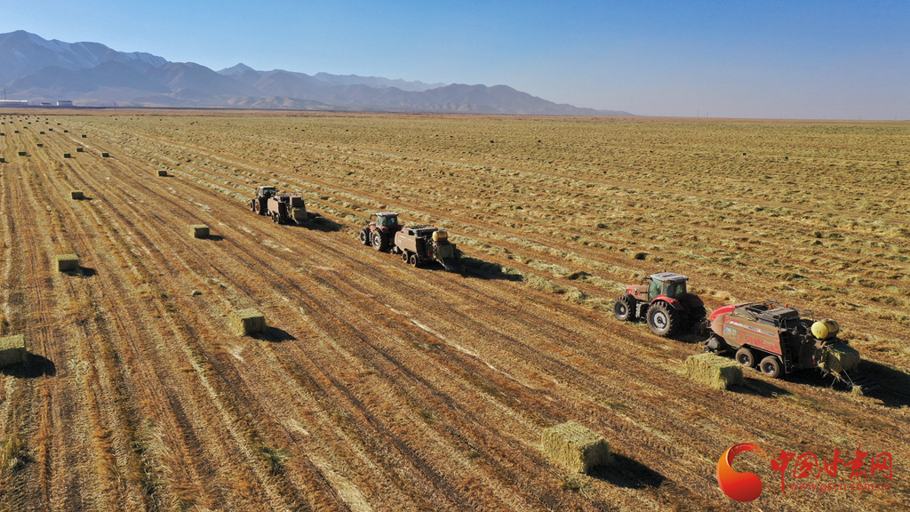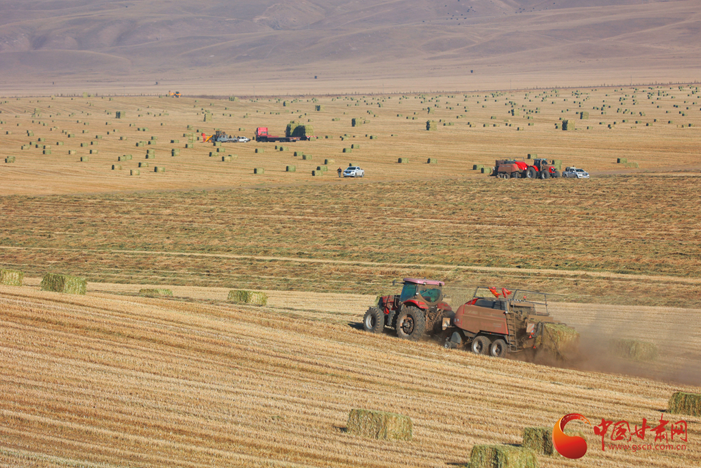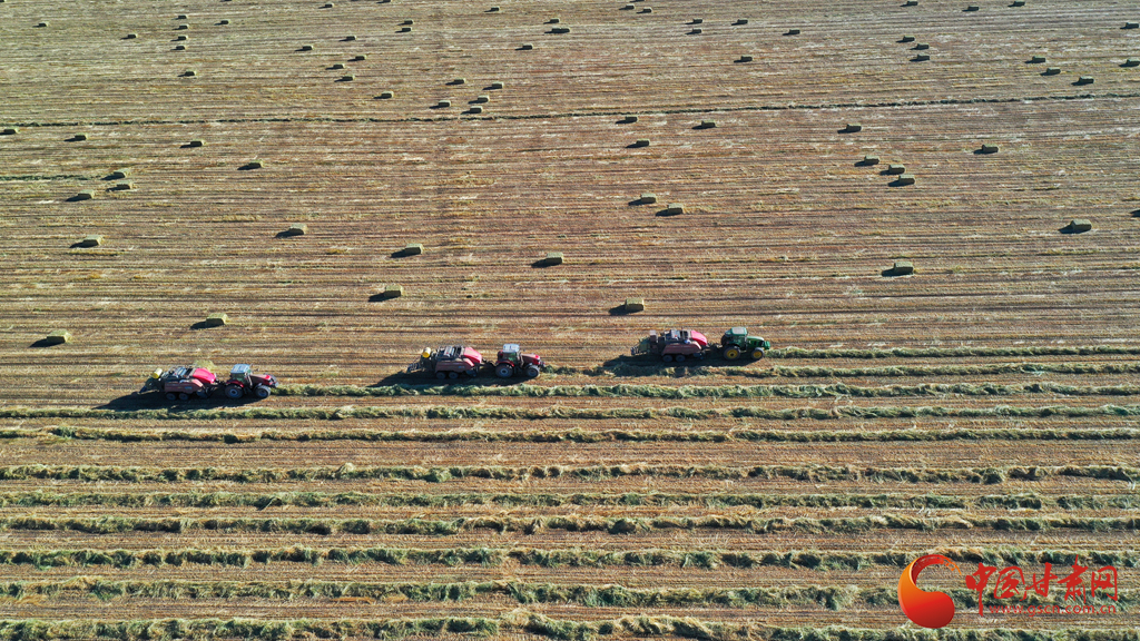 11月9日,甘肅山丹馬場正在對此前收割晾曬的21萬畝燕麥草打包運輸,一輛輛大型農用機械穿梭田間忙碌作業(yè)。