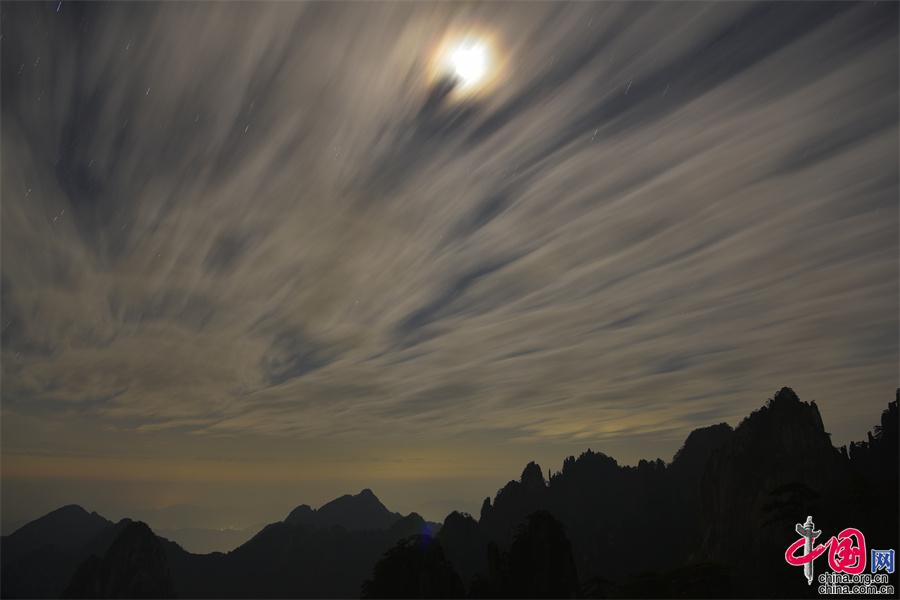 2022年11月8日晚,黃山之巔的群峰上出現(xiàn)的月全食景觀,給美麗的黃山增添一道美輪美奐的風(fēng)景。