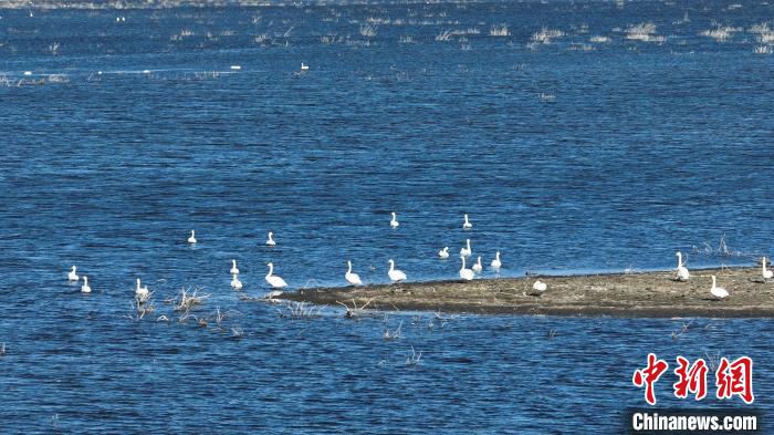 博湖縣境內(nèi)的博斯騰湖白鷺洲迎來大批天鵝。 年磊 攝