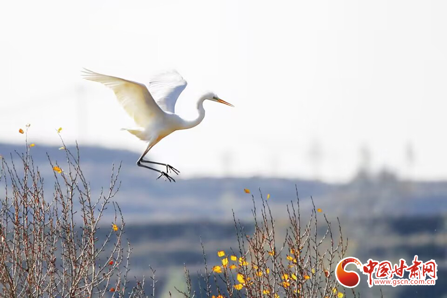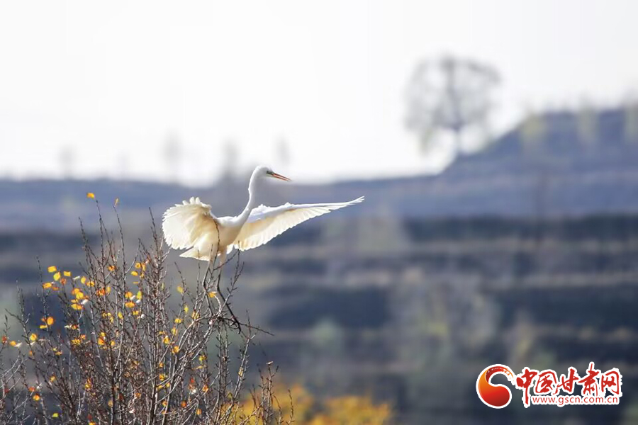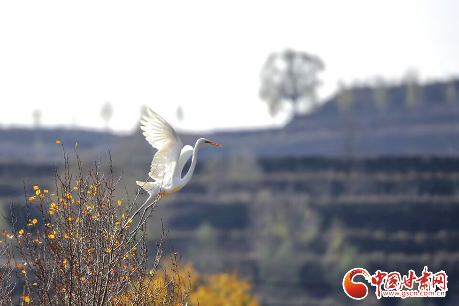 初冬時(shí)節(jié),在平?jīng)鍪谐缧趴h于家灣鷺鳥紛飛,繪就一幅人與自然和諧共生的美麗畫面。