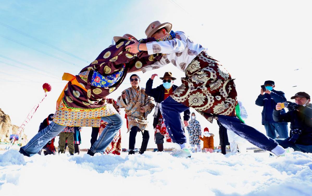 當日,“相約文殊山樂享冰雪趣”,藏族群眾在冰雪運動場上進行雪地鍋莊舞、頂杠子、拔棍、拉爬牛、戶外徒步、雪地摔跤、雪圈滑行追逐、滑冰、電商直播等多項比賽,吸引了周邊群眾和甘肅酒泉、嘉峪關等地的萬名游客前來參觀游覽和參與比賽。