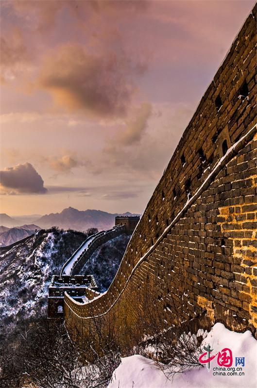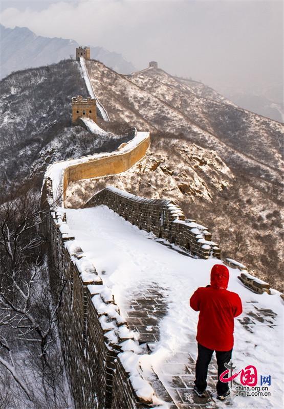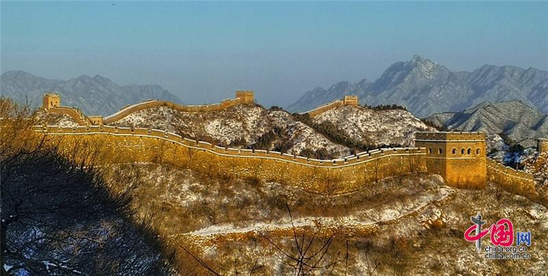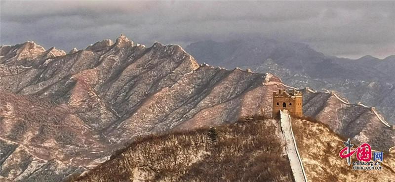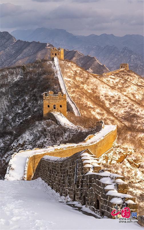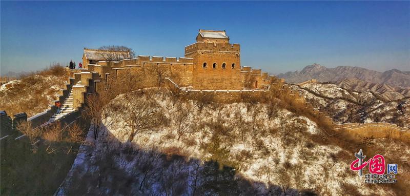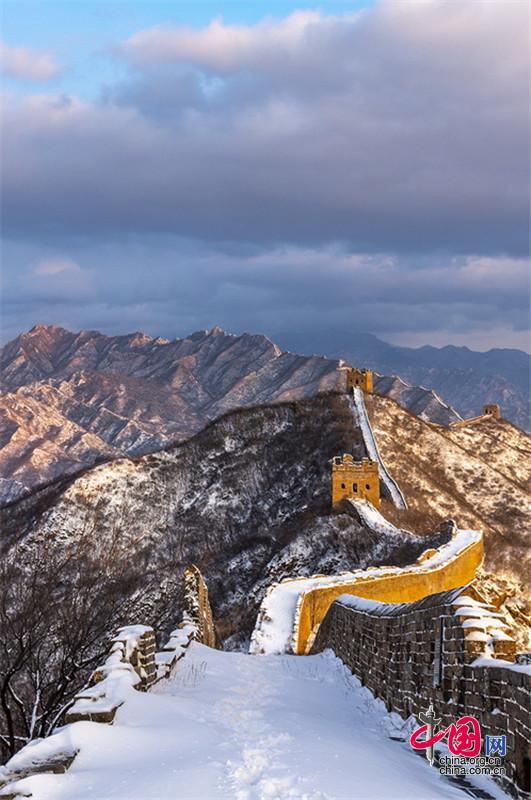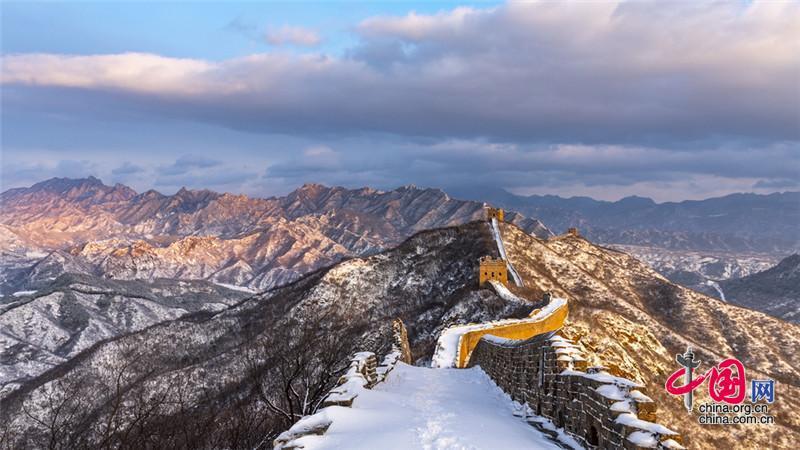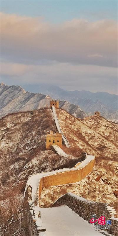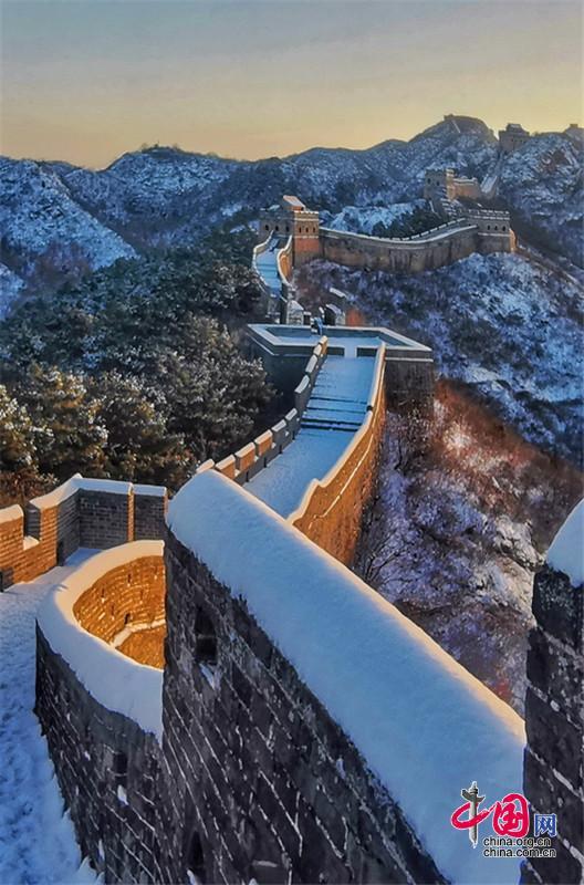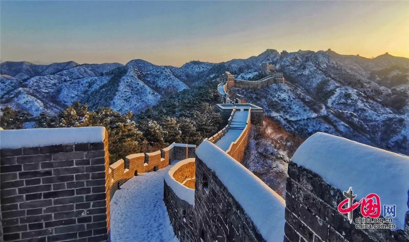 皚皚白雪覆蓋長城內(nèi)外,銀裝素裹金山嶺氣勢磅礴。