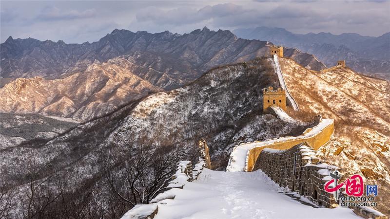 雪后,金色陽光映襯下,河北承德灤平縣的金山嶺長城巍峨壯觀,美如畫卷。