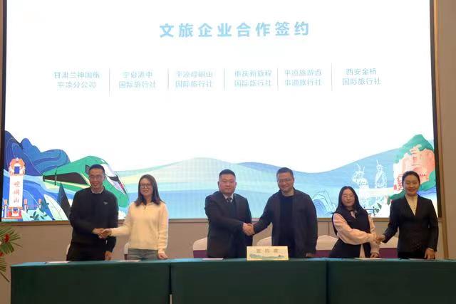 專題推介會上,平?jīng)鍪形幕瘡V電和旅游局推介了全市文旅資源及“引客入平”系列支持政策,崆峒山、大云寺·王母宮、龍泉寺、云崖寺等重點景區(qū)和涇川橙香瑤池溫泉酒店分別作了主題推介。平?jīng)鑫穆猛豆九c西安一帶一路文旅公司、涇川大云恒盛旅游公司與西安黃河國旅、崇信公劉文旅投公司與寶雞春暉旅行社、莊浪關(guān)山文旅投公司與寧夏新文化國旅、崆峒山國旅與重慶新旅程國旅、甘肅蘭神國旅平?jīng)龇止九c寧夏港中國旅、平?jīng)雎糜伟偈峦ㄅc西安金橋國旅等14家省內(nèi)外旅行社分別簽訂“引客入平”客源互送合作協(xié)議。推介環(huán)節(jié)還進行了《神仙留戀的好地方》《崆峒武術(shù)魂》《折柳》和《春天的芭蕾》等文藝表演,與會嘉賓參觀了“問道崆峒·養(yǎng)生平?jīng)?rdquo;文旅形象圖片展、文旅產(chǎn)品市集、非遺技藝展示及網(wǎng)絡(luò)直播和非遺文創(chuàng)產(chǎn)品展。甘肅省文旅廳有關(guān)處室、各相關(guān)市州文旅部門負責(zé)人和省內(nèi)外旅行商、文旅企業(yè)、媒體記者代表,平?jīng)鍪兄攸c景區(qū)、文旅投公司、文創(chuàng)企業(yè)代表共150余人參加。