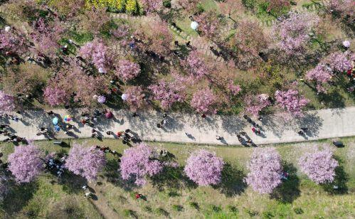 這是3月8日拍攝的都江堰市青城山鎮(zhèn)“問花村”櫻花大道一角(無人機(jī)照片)