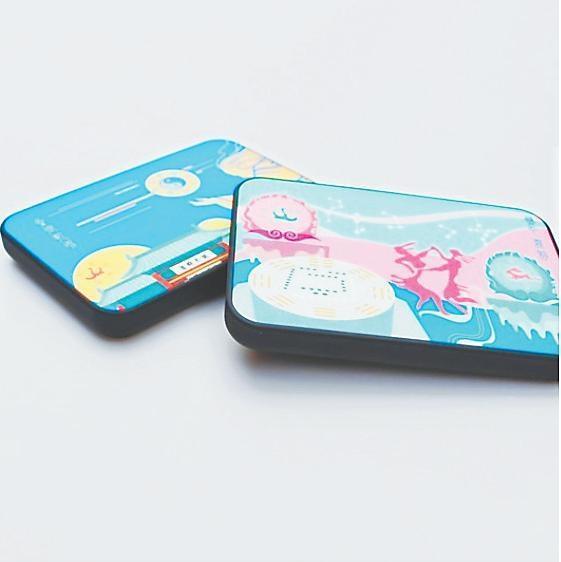 圖案來源于伏羲女媧因分別從山頂推下的兩磨盤緊緊結(jié)合的現(xiàn)象驗證了上蒼意圖,決定繁衍后代的傳說?;瘌B騰飛之日與玉兔奔騰之月隔著天河星辰分懸兩邊,繪有河圖的磨盤見證生命的起源,雙人自由舞動的身軀揚起歡騰的節(jié)律,完美契合于陰陽諧振的樂音。美好寓意的組合充溢起整個載體,令人傾心又矚目于彩色流韻的真景里。