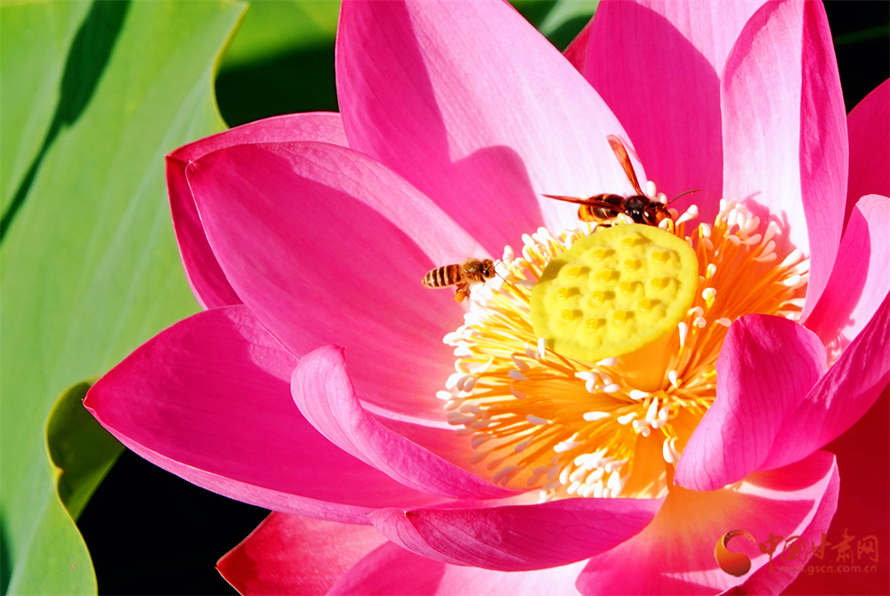 偶有蜜蜂立于荷花枝頭,在陽(yáng)光下展現(xiàn)出別樣風(fēng)采