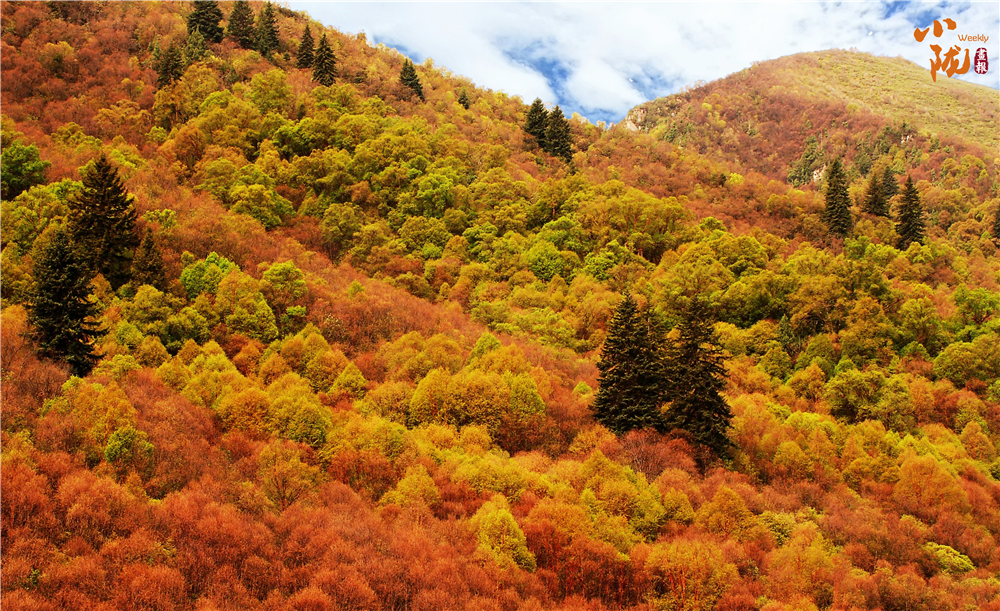 各種樹木依山勢成層密布,在金秋時節(jié)似浪花翻涌,山色隨著季相的變化依次呈現(xiàn)橙紅、嫩綠、碧黛和金黃,可謂層林盡染。
