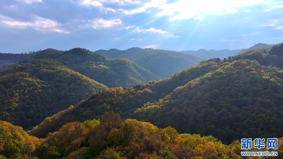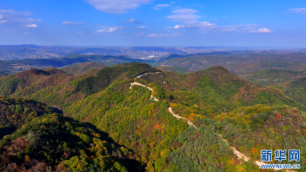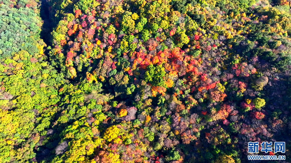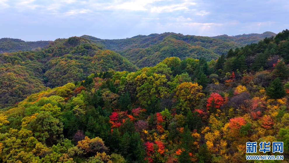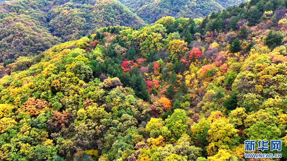 深秋時節(jié),甘肅省平?jīng)鍪谐缧趴h的唐帽山層林盡染,群山疊彩,勾勒出一幅絢麗多姿的美景圖。(圖片:高亮 文字:關改琴)