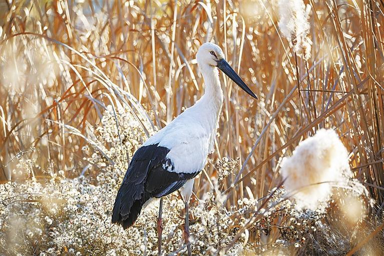 東方白鸛是一種大型涉禽,為鸛形目鸛科鳥類。其體態(tài)優(yōu)美,成鳥體長超過1米,黑翅白體,赤腳長喙,棲息于開闊的沼澤、湖泊和潮濕草地。東方白鸛是少見的旅鳥,因繁殖分布區(qū)域狹窄,野生種群數(shù)量極為稀少,在《世界自然保護(hù)聯(lián)盟瀕危物種紅色名錄》中屬于瀕危等級,是我國一級重點(diǎn)保護(hù)野生動物,有“鳥界國寶”“鳥類大熊貓”之稱。