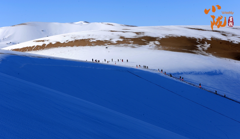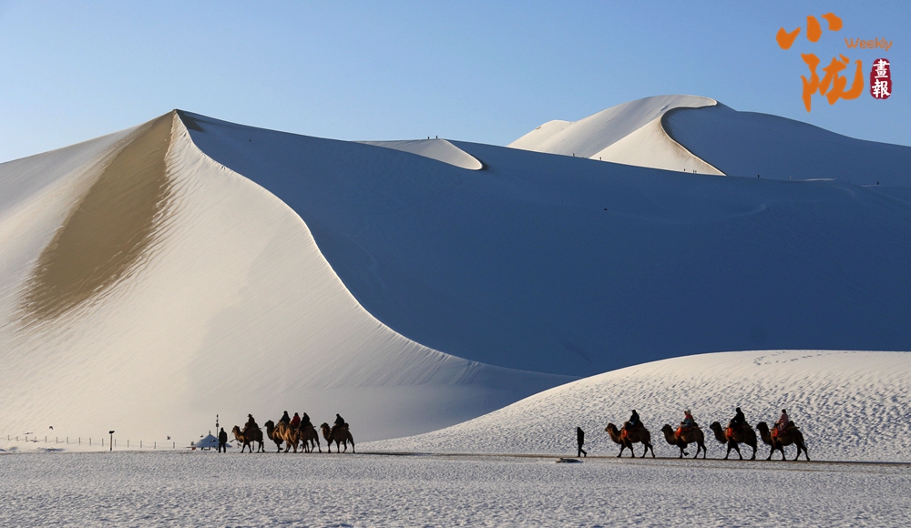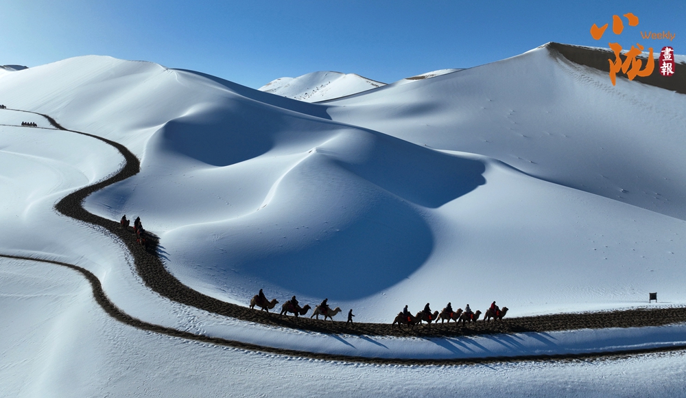 鳴沙山上,連綿不絕的沙海披上銀裝,放眼望去,如詩如畫,美不勝收,吸引了不少游客騎著駱駝踏雪賞景。