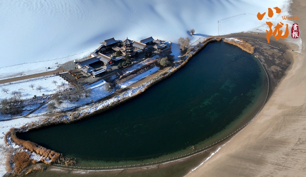 從空中俯瞰,漫漫沙漠覆蓋著白雪,月牙泉成了沙漠的眼睛,構成另一幅美麗的沙海畫卷。