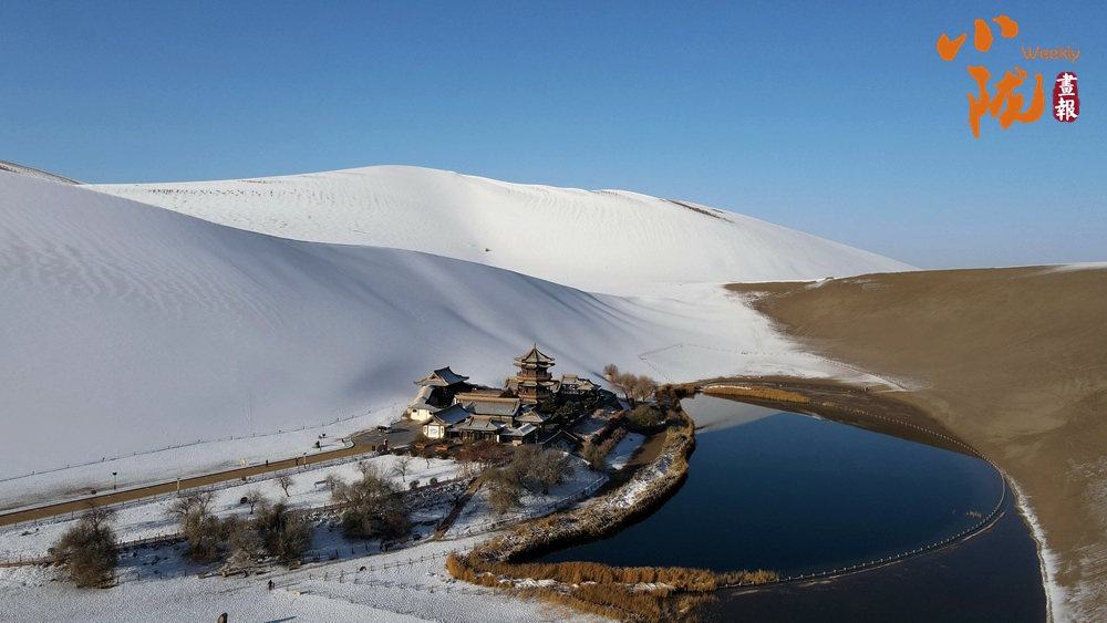 敦煌下雪之后,一半沙漠一半雪。冬日暖陽下,月牙泉像一面鏡子,將沙漠映照得更為浪漫,讓人產生無限遐想。