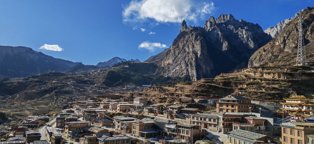 雪后初霽,群山環(huán)抱的扎尕那半隱在繚繞云霧中。一排排榻板房隱匿其間,錯(cuò)落有致。正值深冬,這里的村民們?nèi)蚤e不住:搭建新樓、翻修舊房、鋪設(shè)步道,準(zhǔn)備迎接新一年的旅游旺季。