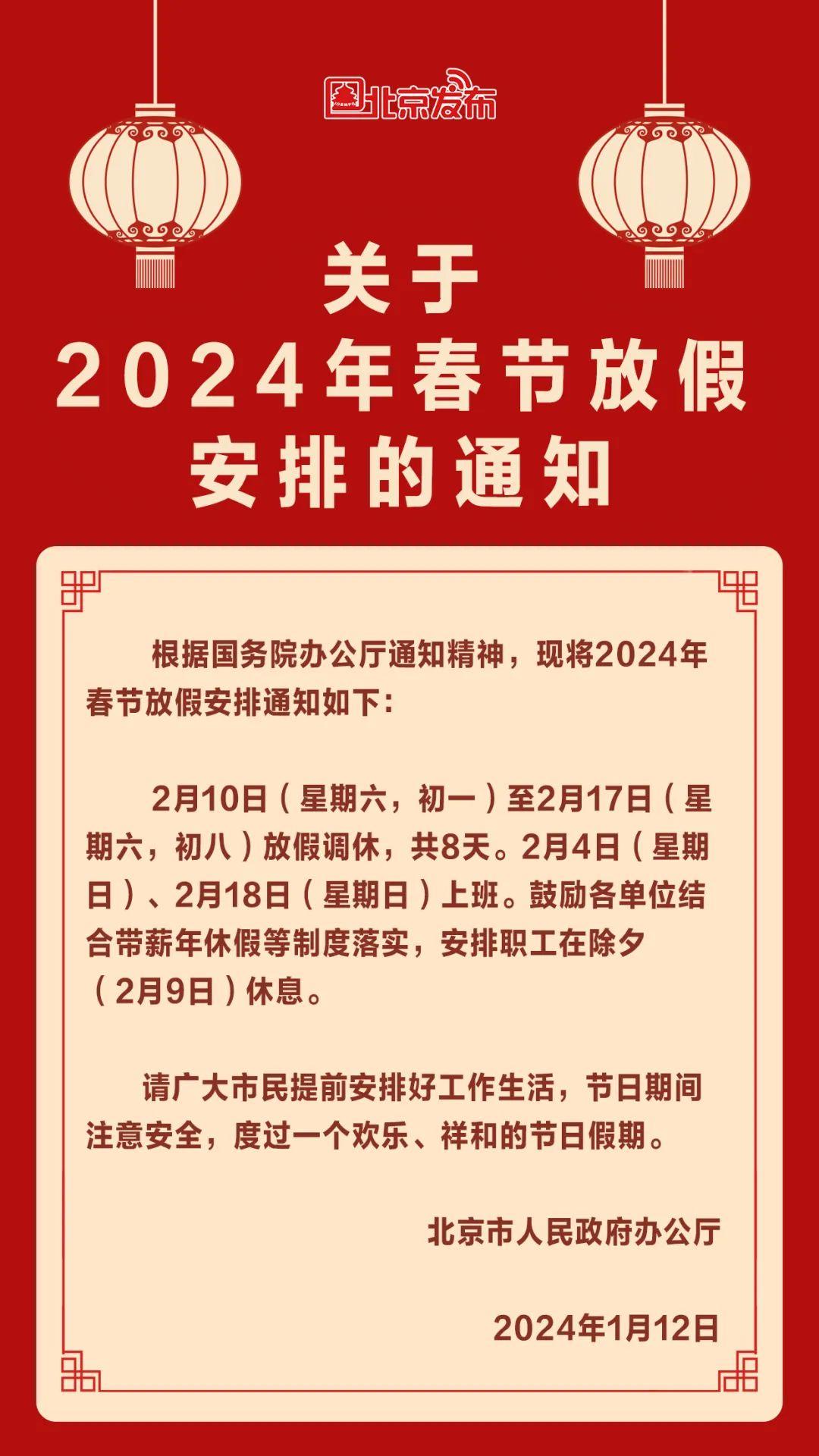 1月12日,北京市人民政府辦公廳正式發(fā)布關于2024年春節(jié)放假安排的通知。通知稱,2月10日(星期六,初一)至2月17日(星期六,初八)放假調休,共8天。2月4日(星期日)、2月18日(星期日)上班。