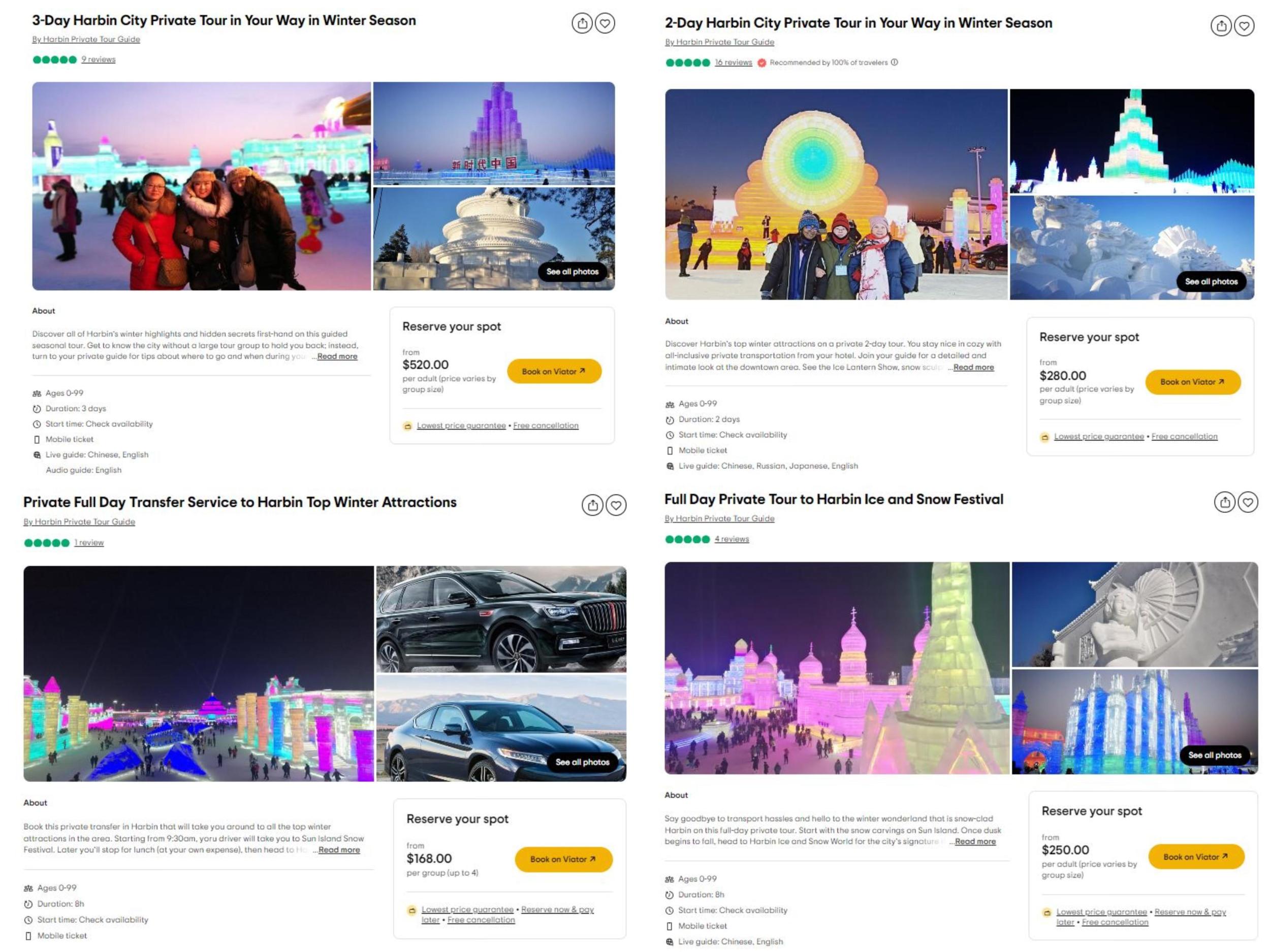 中新財(cái)經(jīng)查看Tripadvisor網(wǎng)站發(fā)現(xiàn),該平臺(tái)上有數(shù)十個(gè)關(guān)于哈爾濱旅游的服務(wù)。其中,“哈爾濱市冬季私人三日游”每位成人收費(fèi)520美元起,“哈爾濱市冬季私人兩日游”每位成人收費(fèi)280美元起,這兩個(gè)服務(wù)的費(fèi)用不包括門(mén)票,包括私人導(dǎo)游服務(wù)、交通費(fèi)(私人汽車(chē)或公交車(chē)/出租車(chē))、酒店接送;“哈爾濱冬季熱門(mén)景點(diǎn)私人全日接送”每團(tuán)收費(fèi)168美元起(最多4人),費(fèi)用不包括門(mén)票等,包括私人汽車(chē)、私人司機(jī)服務(wù)、燃油附加費(fèi)。