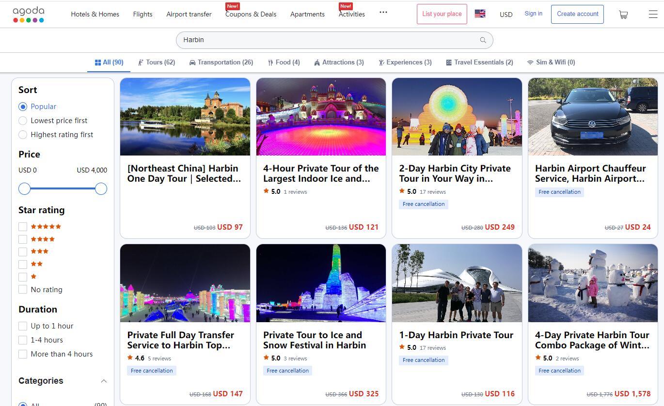 在線預(yù)訂平臺(tái)Agoda上也可以搜索到數(shù)十個(gè)關(guān)于哈爾濱旅游的服務(wù)。大約8小時(shí)的“哈爾濱一日游”,包括私人導(dǎo)游服務(wù)和用車(chē)費(fèi)用,收費(fèi)97美元起。為期2天的“哈爾濱市私人旅游”,包括私人導(dǎo)游服務(wù)、交通費(fèi)(私人汽車(chē)或公交車(chē)/出租車(chē))、酒店接送,收費(fèi)249美元起。(中新網(wǎng)財(cái)經(jīng) 記者 吳家駒)