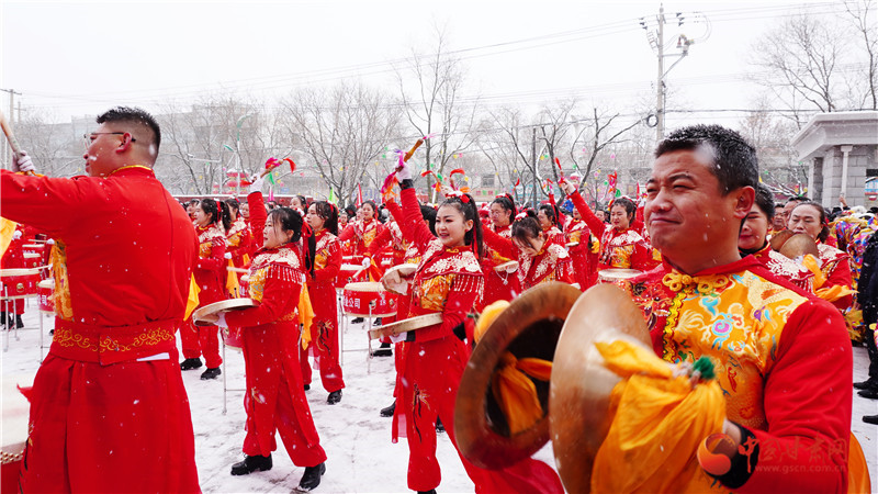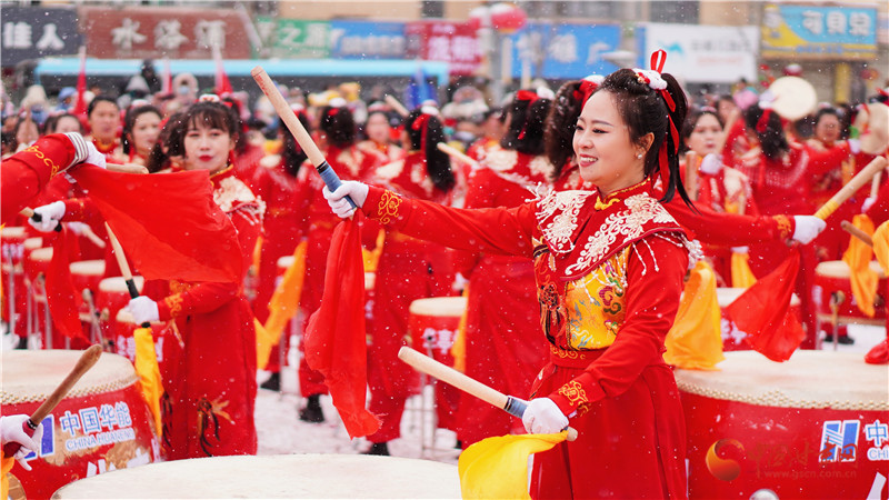 演員們身著喜慶艷麗服裝,頭戴五彩頭飾,手舞彩扇,腰系彩帶,精神抖擻,敲鑼打鼓,盡情表演,贏得陣陣掌聲,現場觀眾紛紛拿手機、相機,記錄這一刻的熱鬧與喜慶。