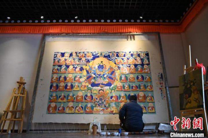 精品唐卡展廳展示甘南藏族唐卡國(guó)家級(jí)代表性傳承人交巴加布,及其父親的唐卡作品,常吸引游人“打卡”。(資料圖)中新社記者 九美旦增 攝