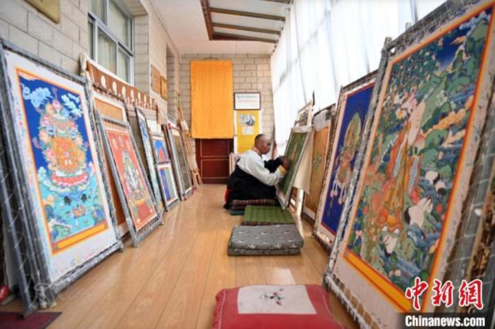甘南藏族唐卡國(guó)家級(jí)代表性傳承人交巴加布,在個(gè)人工作室為唐卡上色。(資料圖)中新社記者 九美旦增 攝