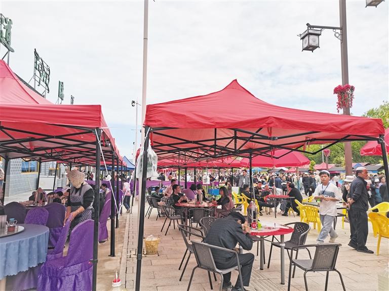 每一個攤點前,坐滿了游客,他們吃著手抓羊肉、釀皮等特色美食,看著花兒會文藝演出,好不愜意。