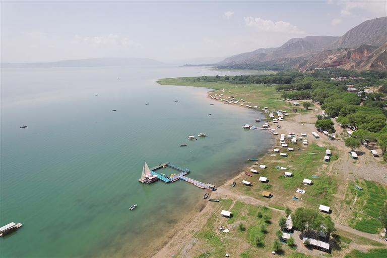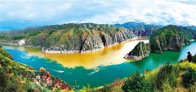 提及永靖劉家峽,第一反應(yīng)就是一個(gè)成語(yǔ)——“涇渭分明”。受上游降水影響,洮河河水比較渾濁,在與黃河交匯處劉家峽水庫(kù)的清波“相遇”時(shí),形成一清一黃兩股水流,河流呈“Y”字形交匯。交融卻不滲透,加上河中的石山,猶如兩條巨龍游戲于此,在當(dāng)?shù)剡@一景象也被稱為“二龍戲珠”。初秋時(shí)節(jié),來(lái)自全國(guó)各地的游客站在黃洮交匯觀景臺(tái)上,感受這份來(lái)自大自然的震撼與壯美,從高處遠(yuǎn)眺入河口,“黃河清,洮河黃”,可謂“涇渭分明”,景色極為壯觀。