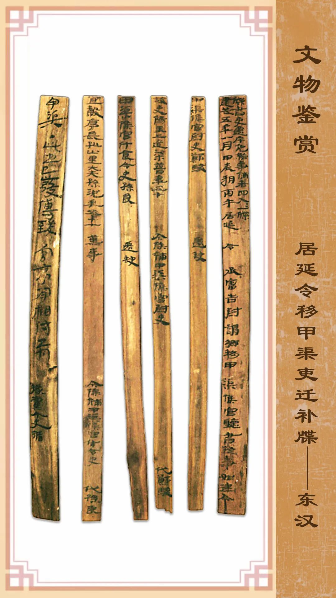 第一簡文字為:“牒書:吏遷、斥免、給事補者四人,人一牒。建武五年八月甲辰朔丙午,居延令 丞審告尉:謂鄉(xiāng)移甲渠候官,聽書從事,如律令。”這是文件的標題和行文要求。“居延令”之后尚留空白,說明這是一份還未正式生效的官員任免文件。其他4簡則是此次任免人員和崗位的具體內容。在簡牘背面書有此文件的起草人掾黨和令史循二人,屬于共同署名。該文書對了解漢代基層吏員的任免、除補等基本程式有重要參考價值。現(xiàn)藏甘肅簡牘博物館。