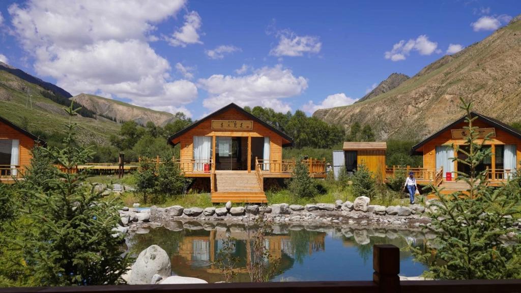 2023年7月起,安玉軍和幾戶村民改造自家院子,騰出開(kāi)設(shè)農(nóng)家樂(lè)、牧家樂(lè)的房子,并打造燒烤和露營(yíng)基地。步入基地,幾池清水將基地分成不同區(qū)域,木屋、牙帳、露臺(tái)散布其間,人們環(huán)繞池間小路行走,周邊連綿的祁連山上松木成林,牛羊悠閑。