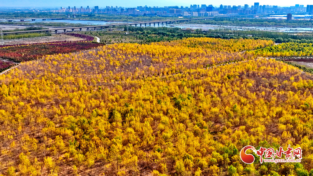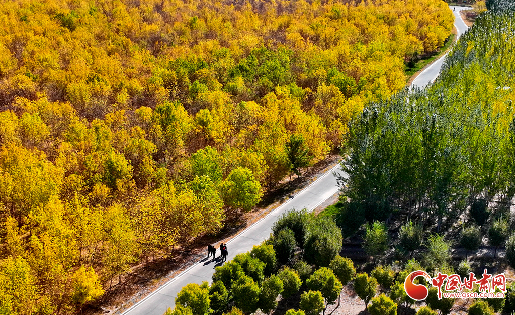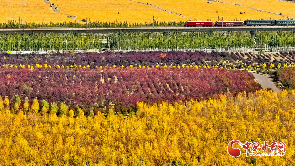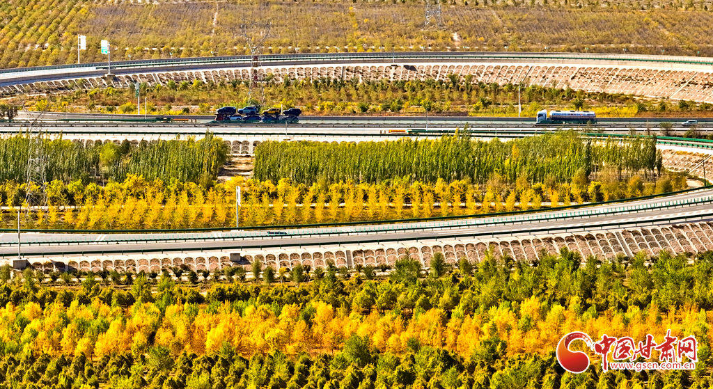 金秋時節(jié),張掖市甘州區(qū)的黑河兩岸,生態(tài)防護林的樹葉逐漸披上金色與紅色,景色迷人。尤其是那延綿的人工胡楊林景區(qū),金黃一片,層巒疊嶂,美不勝收。蘭新高鐵與連霍高速穿梭于這片林海之中,構成了一幅動人的風景線。這里的空氣純凈、環(huán)境寧靜、負氧離子含量豐富,成為了游客和市民休閑觀光的理想之地。