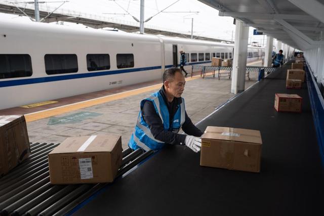 11月11日,在成都雙流西站,工人將電商快件從動(dòng)車上搬運(yùn)下來。新華社記者 江宏景 攝